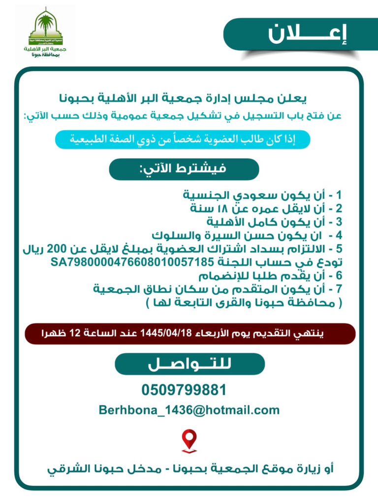 إنعقاد الجمعية العمومية ( الغير العادية ) لجمعية البر الخيرية بحبونا يوم الخميس ١٤٤٥/١٠/١٦هـ